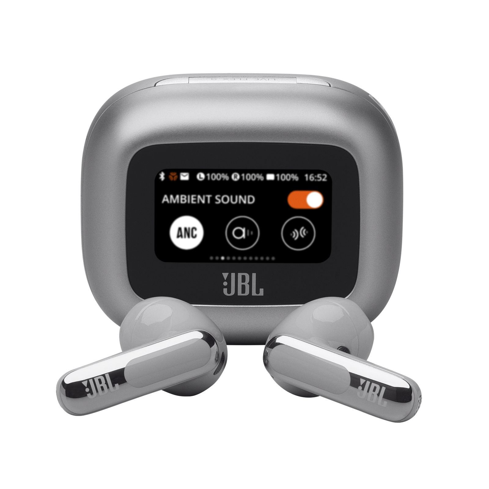 <p>Pas je geluid aan zonder zelfs maar naar je telefoon te kijken. Gebruik de regelaars op de Smart Charging Caseâ„¢ van de JBL Live Flex 3 volledig draadloze noise-cancelling oordopjes met Hi-Res Audio om al hun functies aan te passen zonder de JBL-app op je apparaat te openen. Pas het volume en de equalizer aan, bedien je muziek, beantwoord telefoongesprekken, bekijk berichten. Je kunt zelfs de screensaver aanpassen met je favoriete foto’s. En dat is voordat je zelf kunt genieten van JBL Signature Sound van de Live Flex 3-oordopjes. De allerbeste True Adaptive Noise Cancelling zorgt ervoor dat je niet afgeleid wordt. Met JBL Spatial Sound ga je volledig op in het kijken van films. En als je een telefoontje krijgt zorgen zes microfoons voor een perfecte geluidskwaliteit, zelfs in de meest lawaaierige omgeving. Dit alles, plus 50 uur opladen: 10 uur in de oordopjes* en nog eens 40 uur in de case. Daarnaast zijn de oordopjes draadloos oplaadbaar. De oplaadcase heeft een lus waarmee je ‘m aan<p>
